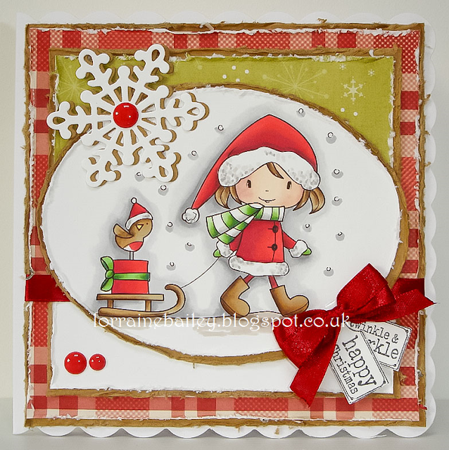 I've coloured her with promarkers and the background papers are from Dovecraft and First Edition. I've used a Sweet Dixie snowflake die and the sentiment tags are from Lili of the Valley.